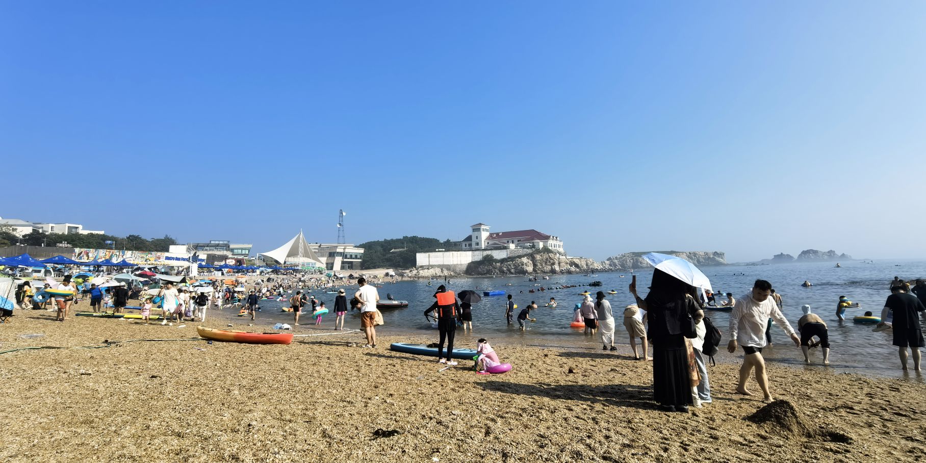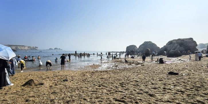 位于中山区滨海东路,地处滨海路东段,与棒棰岛景区紧邻,距市中心 7.5 公里,砂质岸线,A 类公共浴场型,全年全天开放。浴场海岸线长 220 米,沙滩上的沙子呈金色,沙质细腻,踩上去软绵绵的,海水清澈,颜色丰富,从远处的深蓝,到中间的蓝绿色,再到近处的清澈透明一眼见底,宛如 “果冻海”,沙滩两侧分布着礁石,形态各异,为海滩增添了几分独特的景致,也为赶海提供了良好的条件。退潮之后,沙滩两侧的礁石区域会露出水面,游客可以在这里抓到小螃蟹、海蛎子、海虹、花蚬子等,尽情体验赶海带来的乐趣。由于海水较深,适合开展桨板等水上运动,吸引了不少水上运动爱好者前来一展身手。设有更衣淋浴的沙滩服务中心,提供寄存服务,方便游客更换衣物和存放物品。