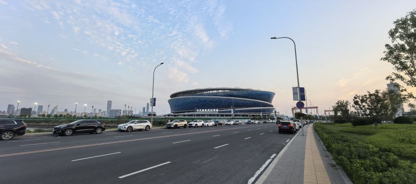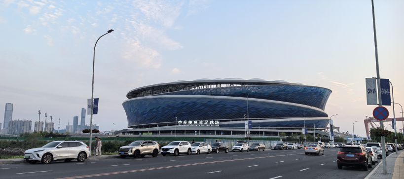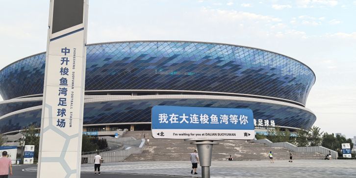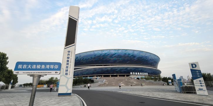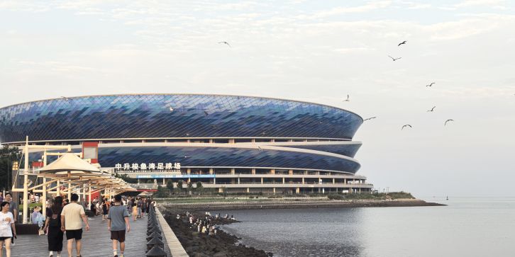 位于甘井子区钻石湾世界滨海公园东侧、万景街以南,与东港商务区隔海相望。2020 年 10 月 11 日正式开工建设,2023 年 4 月 29 日正式投入使用。总占地面积约 26.5 公顷,总建筑面积约 13.6 万平方米,定位为 6.3 万席位特级足球场。绿化面积 4.7 万平方米,道路及广场面积 7 万平方米,室外运动场工程 1.4 万平方米。球场设计灵感来源于 “海浪与海螺”,设计理念为 “炫彩叠浪”,建筑立面定妆色 “海洋蓝”,顶棚呈白色,将大连的海洋文化、足球精神融于一体。由墙面 17000 余套 LED 线性灯,顶棚 784 套 280W LED 投光灯和 420 套 420W LED 投光灯组成。整体泛光以动态光为主,静态泛光为辅,拥有节日、平日、夜间三种不同模式。